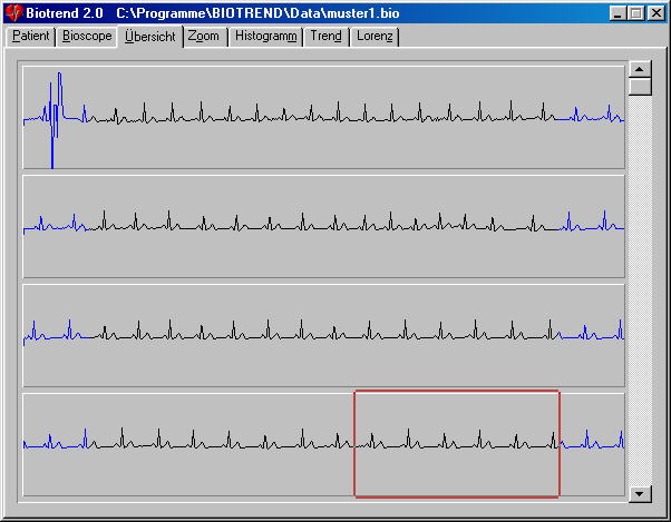 In der EKG-Übersicht werden die aufgezeichneten Signale stark verkleinert dargestellt. Mit dieser Darstellung können Sie sich einen ersten Überblick verschaffen. Zum Vergrößern (Zoom) wählen Sie mittels Maus-Doppelklick einen Bereich aus. Das Programm wechselt automatisch in das EKG-Zoom-Register und zeigt die ausgewählte Sequenz an.